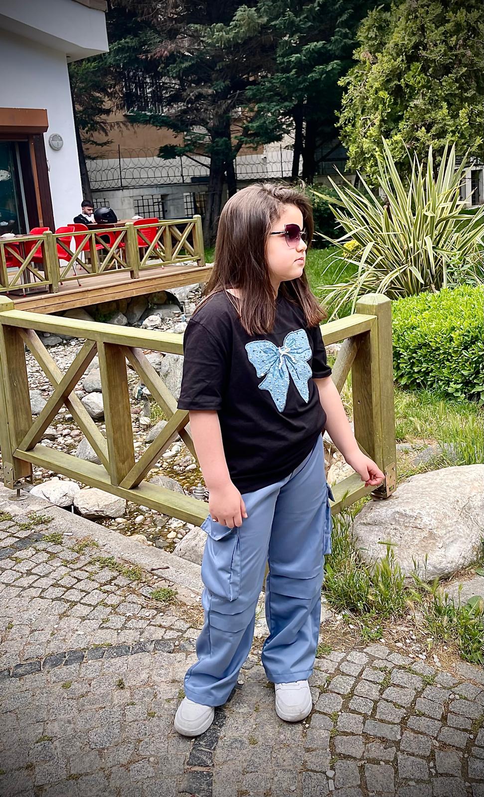 Kelebek Baskılı Siyah T-Shirt ve Mavi Renk Kargo Cepli Pantolon