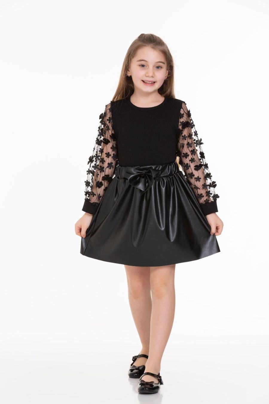 Çiçek Tüllü Deri Etek Takım,Üst Krep Scubo Kumaş,Etek Deri Kumaş,Bel Kemerli.