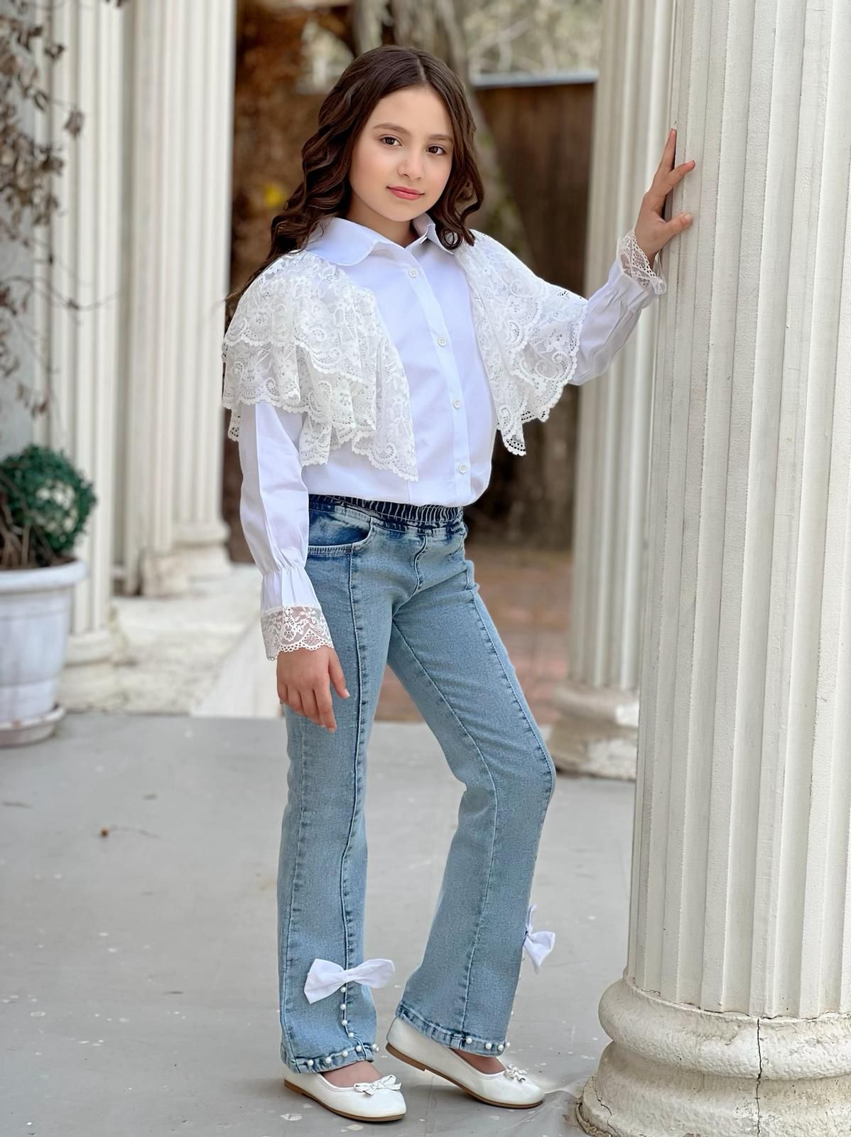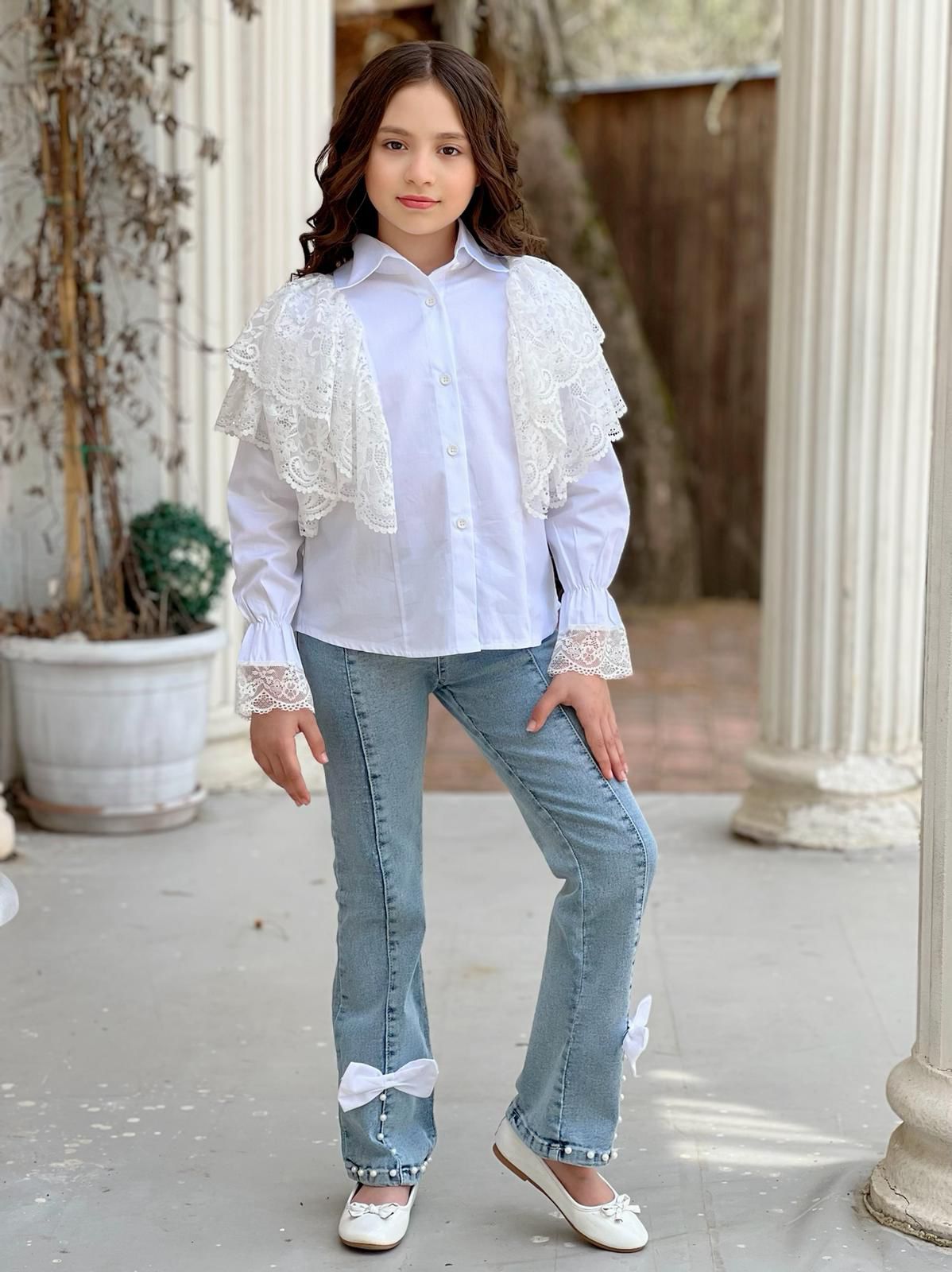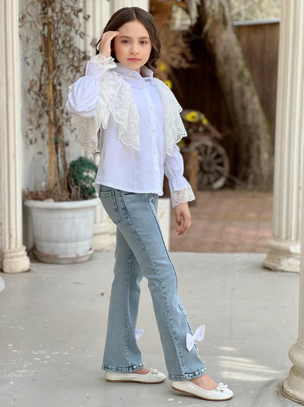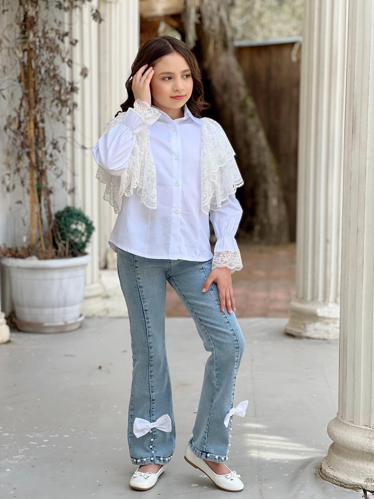 Şıklığı ve rahatlığı bir araya getiren İncili Detaylı Kot Pantolon & Gömlek Kombin, hem günlük kullanımda hem de özel davetlerde göz alıcı bir görünüm elde etmenizi sağlıyor. Bu eşsiz kombin, stil sahibi çocuklar için tasarlanmış olup, zarif detaylarla zenginleştirilmiştir.