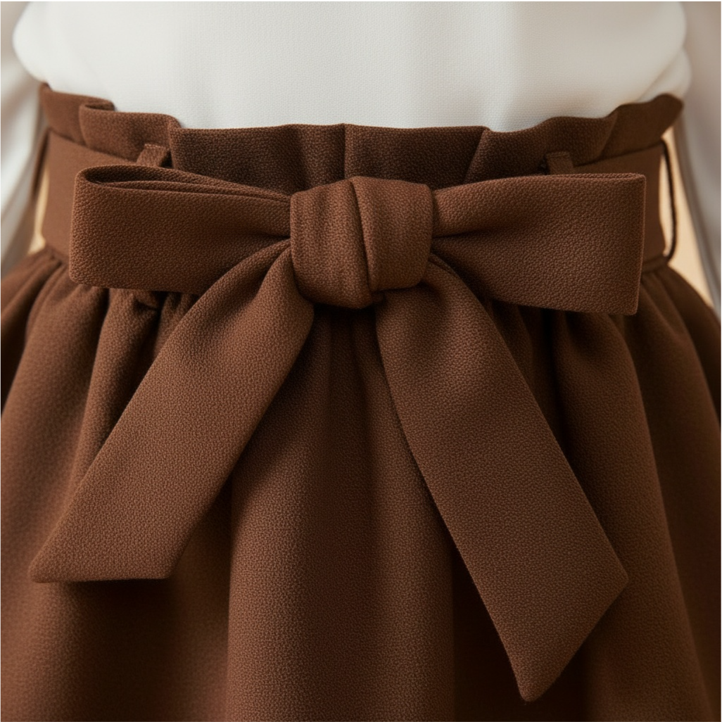 Fiyonk Kuşaklı Etek: Belinde kendi kumaşından şık bir fiyonk kuşağı bulunan, kloş kesimli, canlı kırmızı etek.
