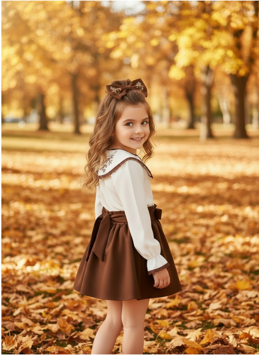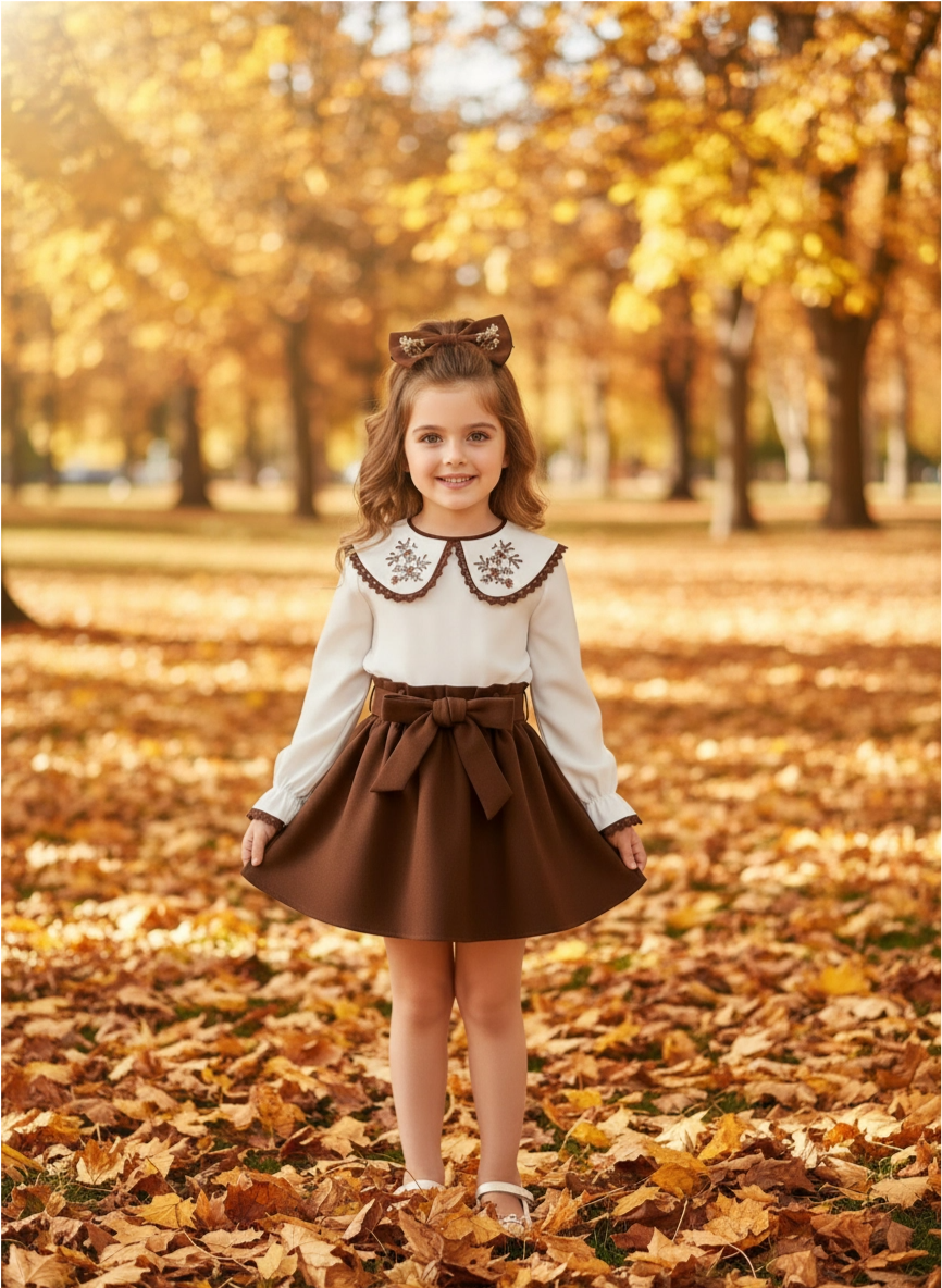 Nakışlı Bebe Yaka Bluz: Yaka kısmında zarif çiçek nakışları bulunan, kollarındaki dantel ve fırfır detaylarıyla hareketlendirilmiş, yumuşak dokulu ekru bluz.