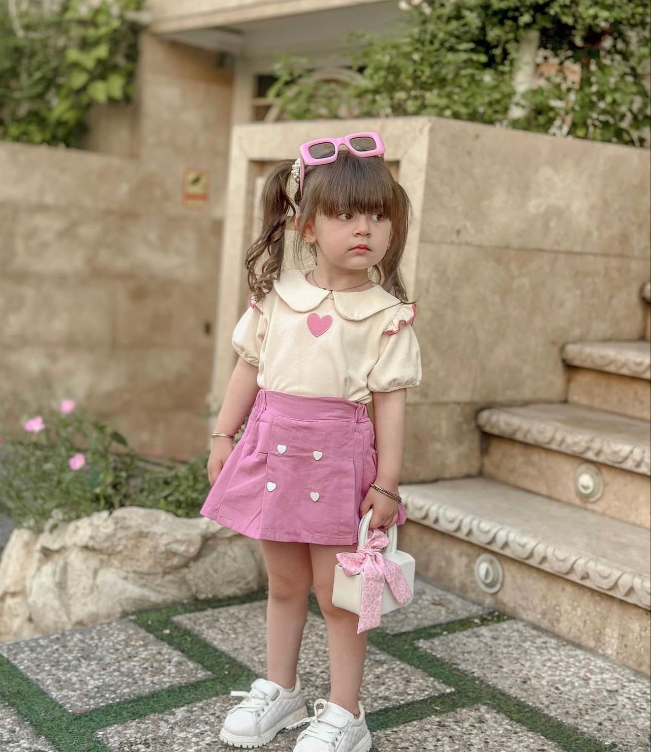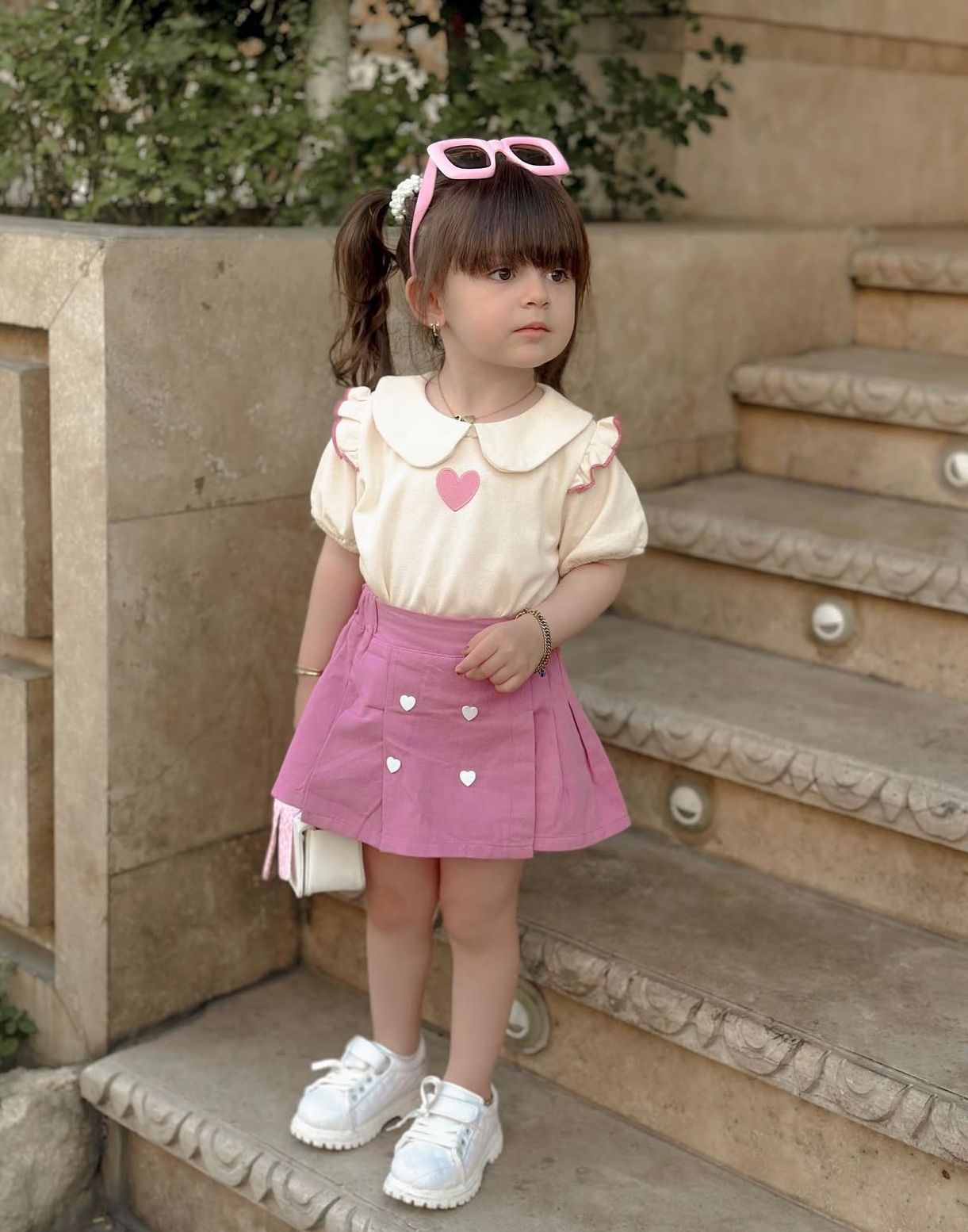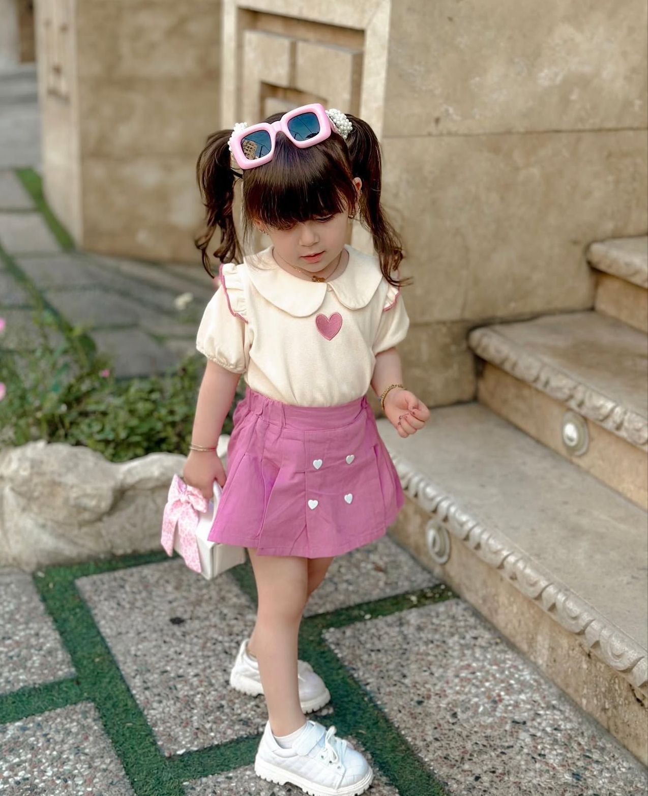 - Tasarım: Şort eteğin yer aldığı ikili kombin, kalp motifli nakış detaylarıyla süslenmiştir. Bu renkli ve neşeli tasarım, kız çocuklarının keyifli görünümünü artırır.